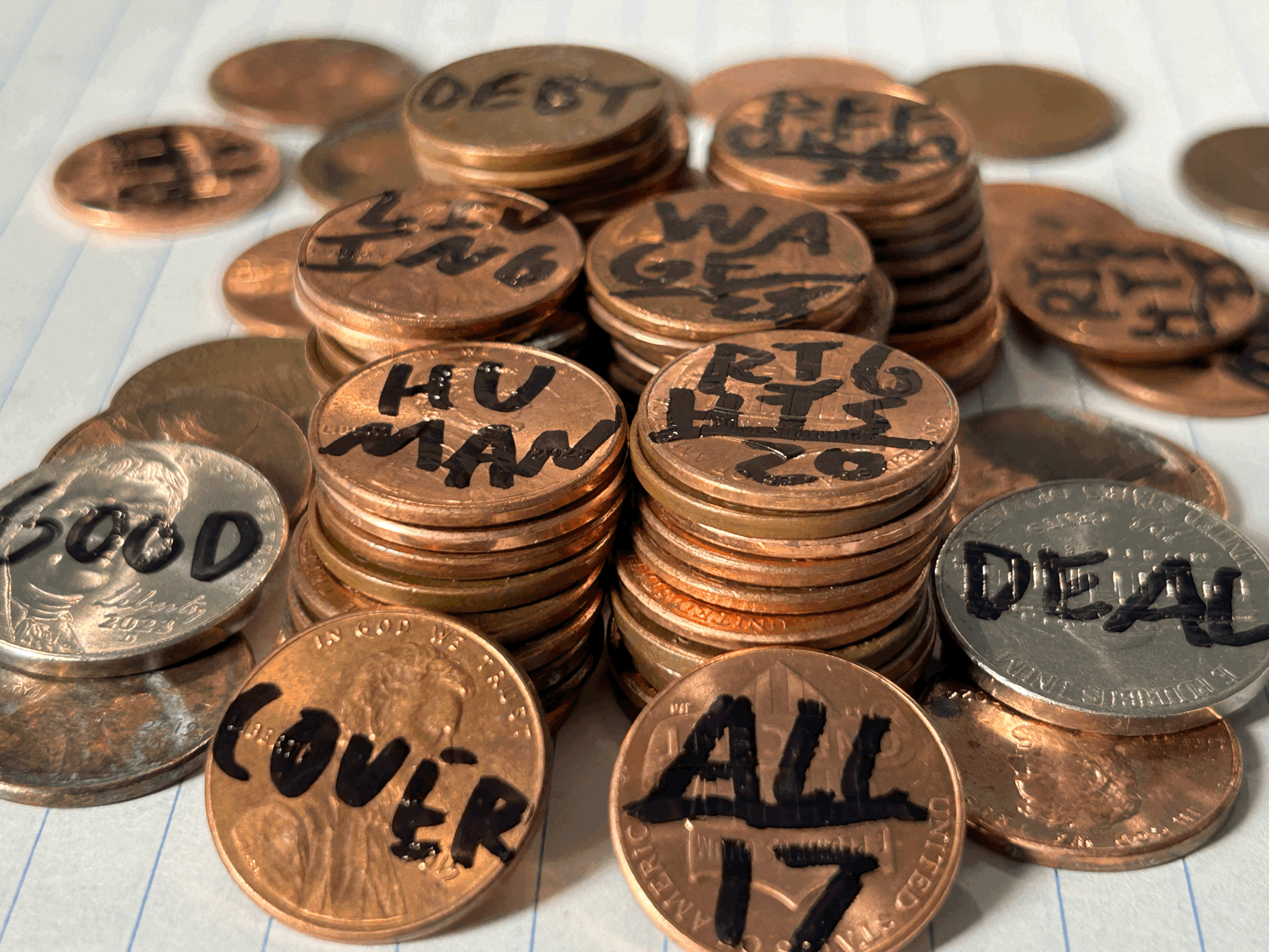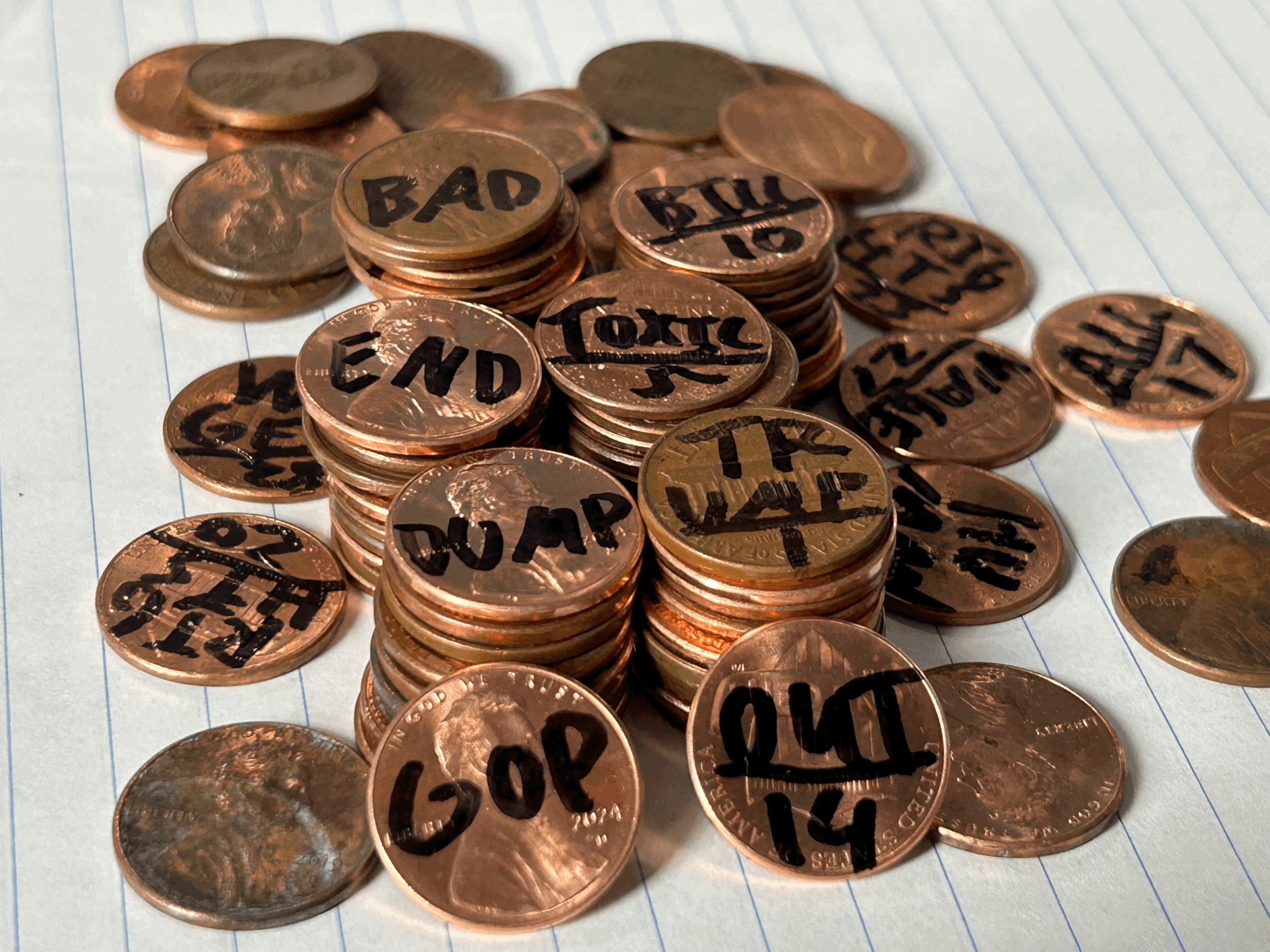 Purchase A Batch of 10,000 Pennies Select A Batch Batch of Protest Pennies or Good Bill Pennies from $1,000.00 Select Phrase Dump Trump End Toxic Bad Bill GOP Out Cover All Human Rights Living Wage Debt Reform Assortment Add To Cart Added!